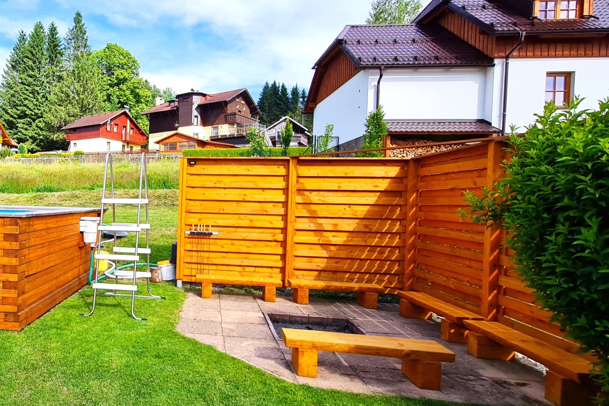 Pro každý apartmán je připraveno samostatné posezení – k dispozici je krytý altán pro nerušenou zábavu, gril, ohniště, houpačky, dětský bazén…